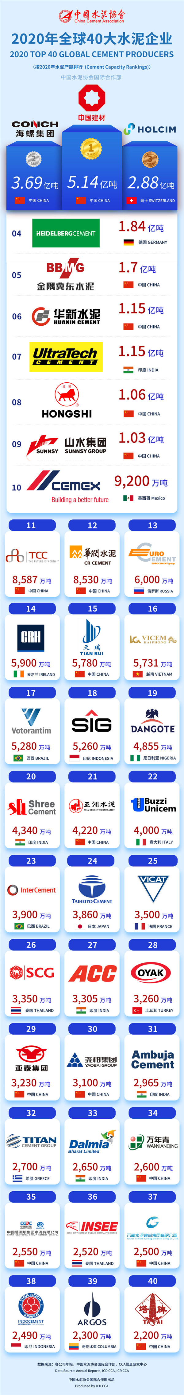 9月18日,中国水泥协会发布“2020年全球40大水泥企业”榜单,该榜单按2020年水泥产能排名,红狮控股集团以1.06亿吨水泥产能列全球第八位、中国第五位。