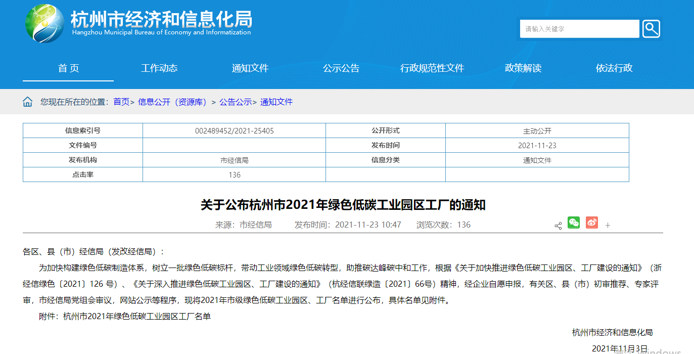为加快构建绿色低碳制造体系,树立一批绿色低碳标杆,带动工业领域绿色低碳转型,助推“碳达峰、碳中和”工作。杭州市经济和信息化局开展了“绿色低碳工业园区工厂创建评选”活动。