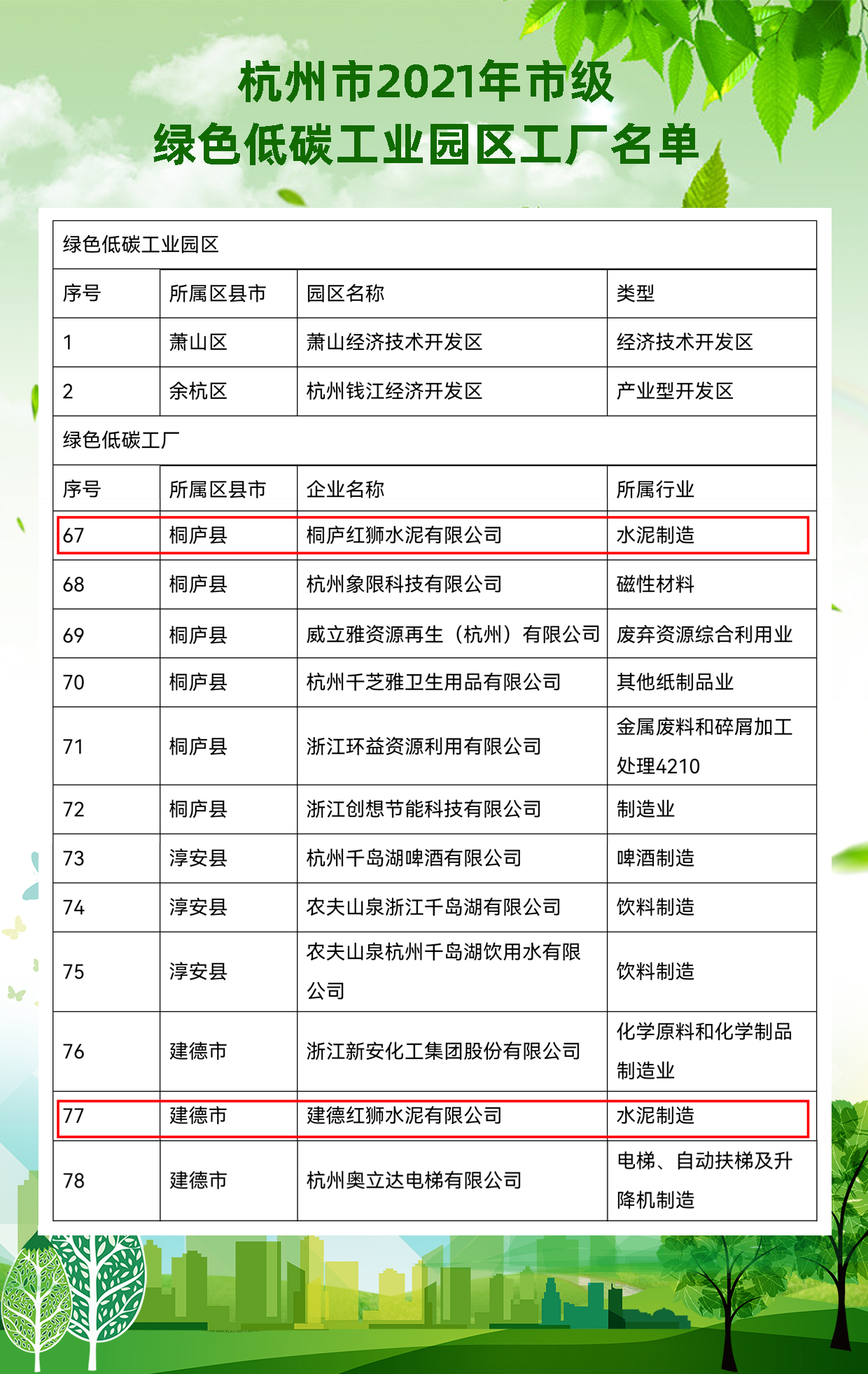 建德红狮、桐庐红狮荣获“杭州市2021年市级绿色低碳工厂”