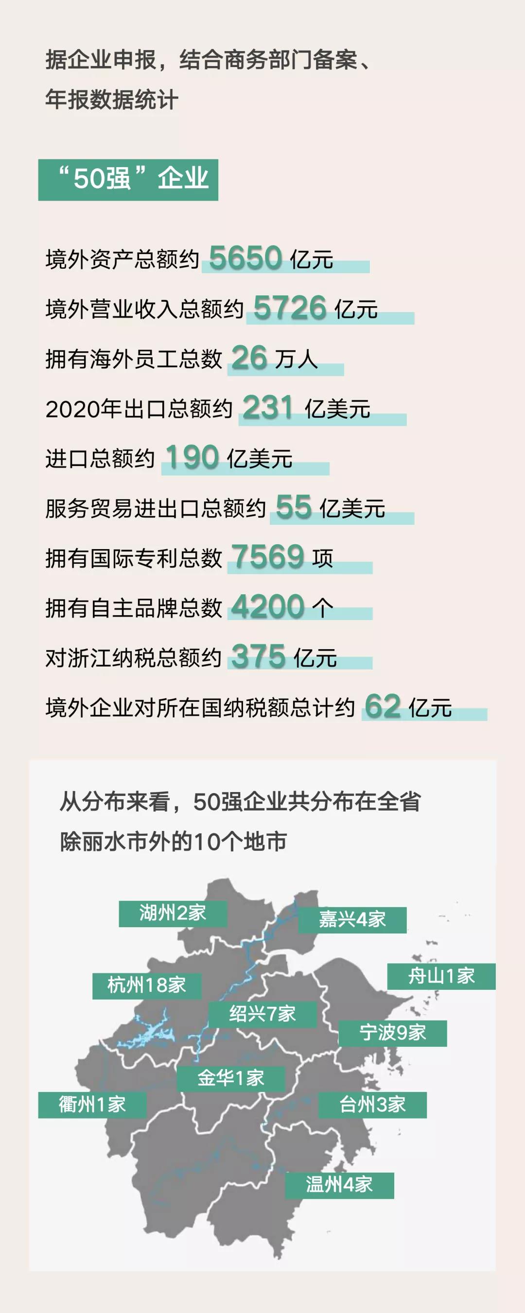 尽管受到新冠肺炎疫情以及世界范围内贸易摩擦增加、投资审查趋严的影响,2021年浙江省“50强”企业的主要国际化指标还是出现逆势上升。本土民营跨国公司,已经成为引领浙江省高水平“走出去”的主力军,为打造“一带一路”浙江枢纽发挥了主体支撑作用,其做大浙江总部经济和拓展国际市场空间的双轮驱动发展路径,对构建国内国际双循环新发展格局意义重大。