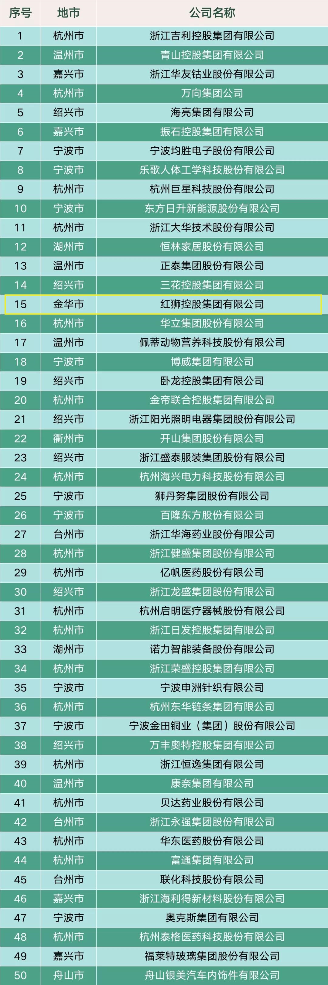 红狮集团列2021年浙江本土民营企业跨国经营50强第15位