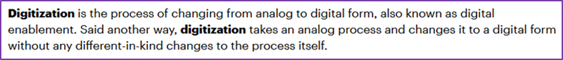 “Digitization是从模拟形式转变为数字形式的过程,也称为数字使能。Digitization采用模拟过程并将其更改为数字形式,而不会对过程本身进行任何不同种类的更改。”“Digitalization是指利用数字技术改变商业模式,并提供创造收入和价值的新机会,它是转向数字业务的过程。”实际上,尼葛洛庞蒂口中的“数字化”以及Gartner定义的Digitization是狭义的数字化,而Digitalization对应的才是我们常说的广义上的数字化。数字化至今也没有官方定义,我们暂且不用纠结英文翻译的问题,关键在于理解数字化的内涵。数字化是利用新一代信息技术,包括云计算、大数据、AI、物联网等,实现研发、生产、运营、管理、营销和服务全方位的数字化,推动业务模式重构、管理模式变革、商业模式创新和企业核心能力的提升。数字化是在信息化的基础上把业务转化为数据,并以数据驱动业务的发展。数字化是企业由实体经济向数字经济的转变,是企业由物理世界向数字世界的迁移。从以上的定义中,其实还是很难明确的分辨出信息化与数字化的区别。我们不用沉迷于分辨各种名词、术语,而是从本质内涵来深入解读它们的差异。
