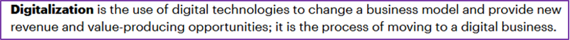 数字化的概念起源于欧美。1995年,美国麻省理工学院教授尼葛洛庞蒂的《数字化生存》一书,宣布以“比特”为存在物的数字化时代的到来。数字化是指使用0和1两位数字编码来表达和传输一切信息的一种综合性技术,即将电话、电报、数据、图像等各种信息都变成数字信号。数字化相关的英文有Digitization和Digitalization。全球知名IT咨询公司Gartner对Digitization和Digitalization的解释分别是: