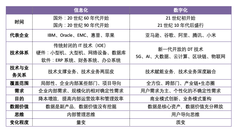 信息化使用的是传统封闭的IT技术体系,而数字化使用的是新兴开放的DT技术体系。IT技术也就是信息技术,硬件以“IOE”为代表,即IBM的小型机、Oracle的数据库以及EMC的存储设备。软件包括ERP系统、财务系统、OA办公系统、CRM客户管理系统等。DT技术也就是数字技术,以5G、AI、大数据、云计算、区块链和物联网为代表,是新一代信息技术。在信息化阶段,可以明确区分出自动化技术、通讯技术、信息化技术等。而数字化阶段,工业化、自动化、信息化、数字化、甚至是智能化技术已经融合在一起,很难区分清楚。信息化考虑的是内部资源的优化,最终形成一套封闭的技术体系。而数字化要实现与供应商、客户等利益相关者的数据集成,因此构建的是开放的技术体系。信息化是技术支撑业务、技术业务两层皮,而数字化是技术赋能业务、技术与业务深度融合。信息化是以业务流程化、标准化为前提的,用信息技术将线下的业务流程搬到线上,交给信息系统来管理,以提升企业内部的管理效率、运营效率。信息化让企业内部人员清楚的了解业务进展的状态,从而为业务的开展提供支撑。信息化时代业务在物理世界开展,信息系统提供支撑。企业有什么业务就建设什么信息系统。例如我们熟知的OA办公系统、ERP资源管理系统、CRM客户管理系统、SCM供应链管理系统以及MIS管理信息系统。信息化不改变业务本身,还是按照线下的流程去走,只是加快了信息传递、流通的速度,从而提升效率、降低成本。数字化时代让内外所有资源和全业务流程,都与技术产生真正的交互,并对内外数据的交互做分析和处理,进而改变传统的商业运作模式。数字化是要实现业务在数字世界开展,实现业务的数字化,使得企业能在一个数字化的商业环境中发展出新的业务、创新商业模式。也就是说,数字化会通过数字技术改变原有的业务流程、经营模式,包括研发模式、生产模式、营销模式、决策模式等。这是数字化与信息化最本质的区别。以出租车业务为例,传统的业务流程是乘客在路边招手、出租车司机看到后就过去停靠,路线通常由司机选择,这是在物理世界里开展业务。出租车背后有司机管理系统、车辆调控系统等,这是信息化。而数字化的网约车将传统的出租车揽客过程搬到了数字化平台上,业务在数字世界展开:乘客在App上约车、选择目的地,司机依附于网约车平台,发布自己的行驶轨迹,通过系统算法匹配到合适的乘客,抢单揽客,接到乘客之后系统会自动规划好路线、抵达时间和费用。与传统出租车司机开着车到处寻找乘客不同,这种业务模式只能在网约车平台(数字化空间)开展,这就是数字化。信息化不涉及跨部门问题,而数字化涉及到跨部门数据打通乃至跨组织的数据融合。信息化是针对局部业务进行优化,是局部性、项目导向的,主要在单个或多个部门内部应用,很少有跨部门的融合,更少有产业链上下游的整合和集成。这样导致的结果就是信息系统之间是相互割裂的、独立的,形成了信息孤岛。比如查询相关数据,则需要登录企业的不同系统,销售是一套系统、库存是一套系统、客户数据是一套系统,数据查询要花费很多时间。不同信息系统之间没有交互功能,每个信息系统都有自己的数据库、操作系统、应用软件和用户界面,完全是独立的体系。数字化则强调整合所有业务流程、覆盖全域系统,需要全方位的设计蓝图和路线图。将企业整个业务流程进行数字化打通,破除部门墙、组织墙,跨部门甚至是跨上下游的系统互通互联、数据融合,打通整个价值链甚至是生态圈。所以,我们之前说数字化转型中会遇到数据共享问题、需要设计跨部门的利益分配和激励机制,其根本原因就在于此。这一现象在信息化建设中是不存在的,这是数字化带来的数据治理新挑战。例如,在美的数字化1.0阶段,最高管理层经过对集团自身的调查研究,发现企业大规模IT系统加起来有100余套,系统、流程、数据都是分散的,系统与系统之间数据无法拉通,流程不一致,无法实现集团统一管理。于是,美的提出了“632”战略,目的是实现“一个美的、一个体系、一个标准”,打通6大运营平台(ERP、SRM、MES、APS、PLM、CRM),3大管理平台(BI、FMS、HRMS)以及2大技术平台(MIP、MDP),实现一个流程、一个数据、一个系统。“632”项目实施之后,所有的流程和系统都被重构、分散在企业的数据都被汇总、统一整理,为美的全面的数字化转型奠定了基础。信息化面对的是规模化、确定性的需求,以企业内部需求为主。数字化面对的是个性化、不确定性的需求,以用户需求为主。信息化的核心目的是降本增效、提高内部运营效率和管理效率,本质上是解决内部管理问题。信息化不改变业务本身,只能让业务运作的更好、更快,不能决定业务的成败。数字化的核心目的是创造新的商业模式,改变经营模式,增强用户体验,构建新的核心竞争力,提升企业效益。例如,ofo共享单车从用户短距离出行的痛点入手,依托数字化技术实现了从“卖单车”到“单车分时租赁”的商业模式转变,其核心业务实现了数字化。三一重工从卖挖掘机到提供产品远程运维服务,应用数字技术实现了从制造产品到提供数字化增值服务的商业模式转变,解决了施工设备故障不能及时修复的痛点。数据是信息化的副产品,数据价值没有被挖掘;数据是数字化的核心