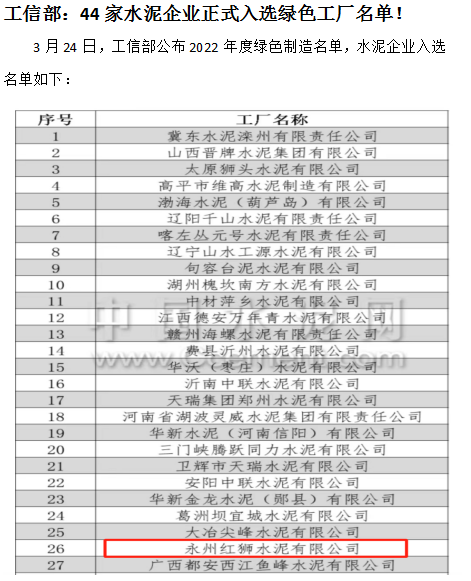 3月24日,国家工业和信息化部下发《关于公布2022年度绿色制造名单的通知》,44家水泥企业入选“绿色工厂”名单,永州红狮为其中之一。
