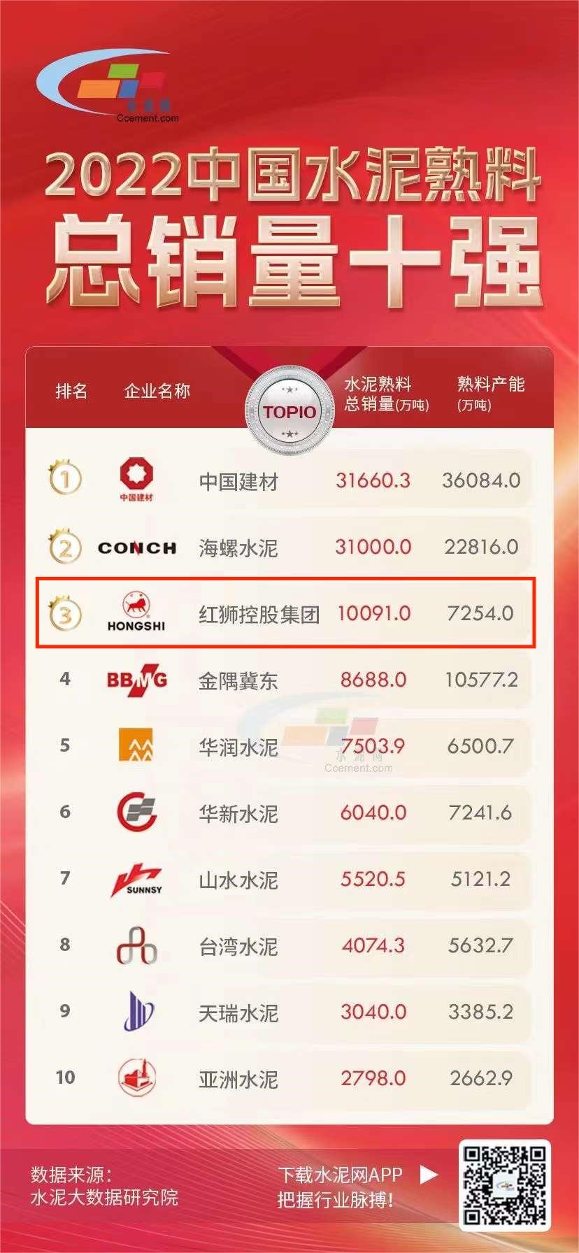 近日,中国水泥网水泥大数据研究院发布2022中国水泥熟料总销量十强榜单,红狮集团以总销量10091万吨位居第三。