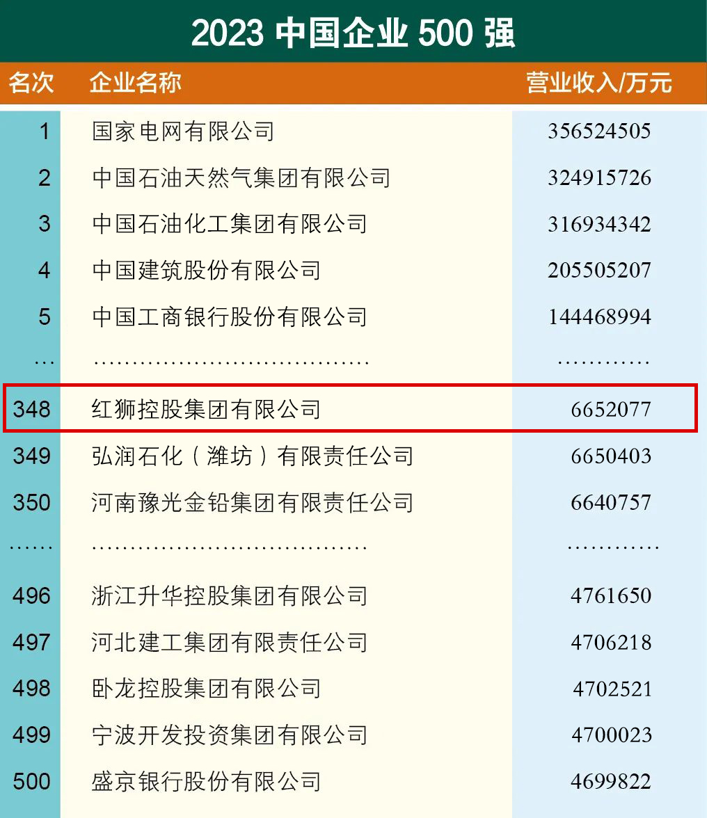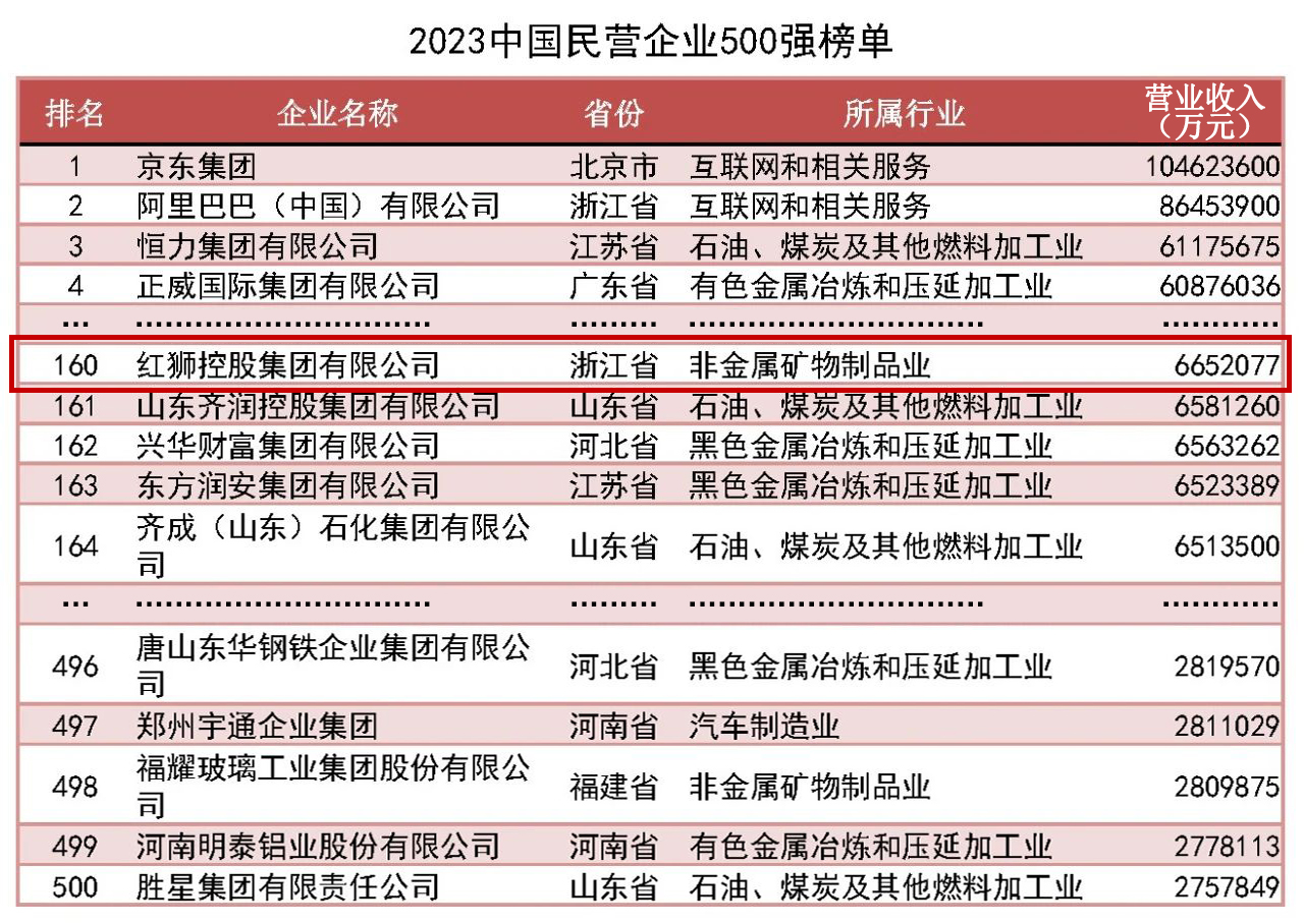 红狮集团位列2023中国企业500强第348位、中国民营企业500强第160位