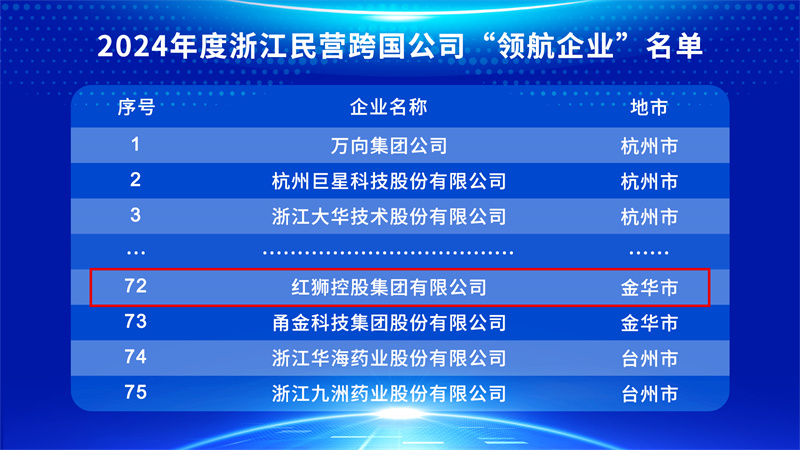 红狮集团连续六年荣获浙江本土民营跨国公司“领航企业”称号