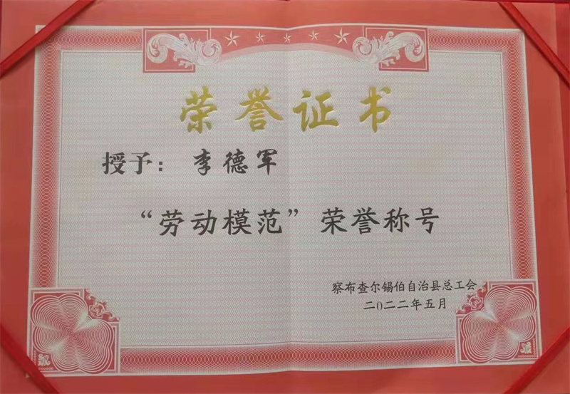 新疆金龙李德军荣获察布查尔县总工会“劳动模范” 荣誉称号